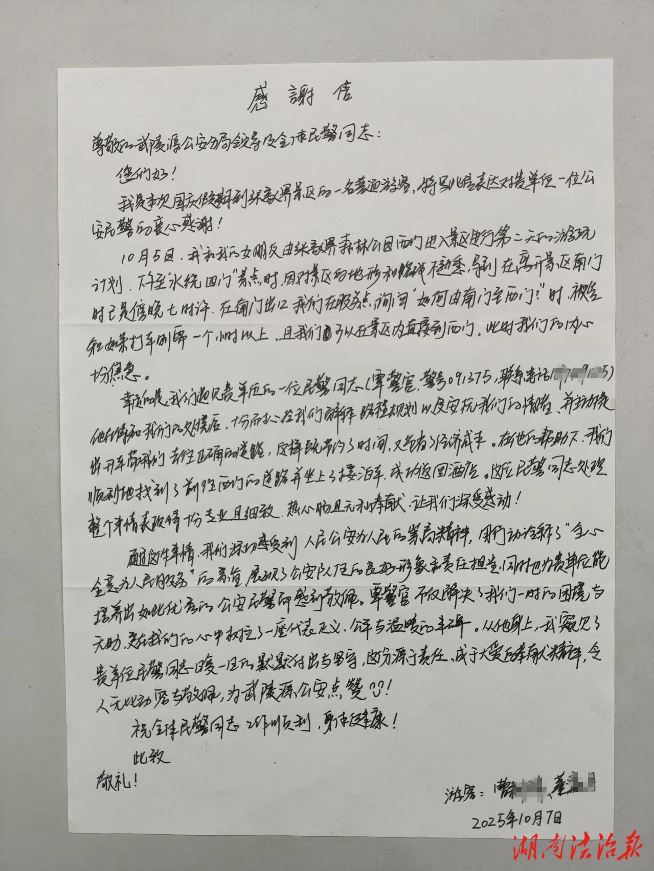 紙短情長(zhǎng),字見初心。2025年10月11日,張家界市公安局武陵源分局收到了一封來自外地游客的手寫感謝信。感謝信娟秀工整的字跡里,藏著一段發(fā)生在張家界國(guó)家森林公園景區(qū)南門的暖心故事,映照出武陵源公安對(duì)“旅游警務(wù),平安服務(wù)”的生動(dòng)詮釋。