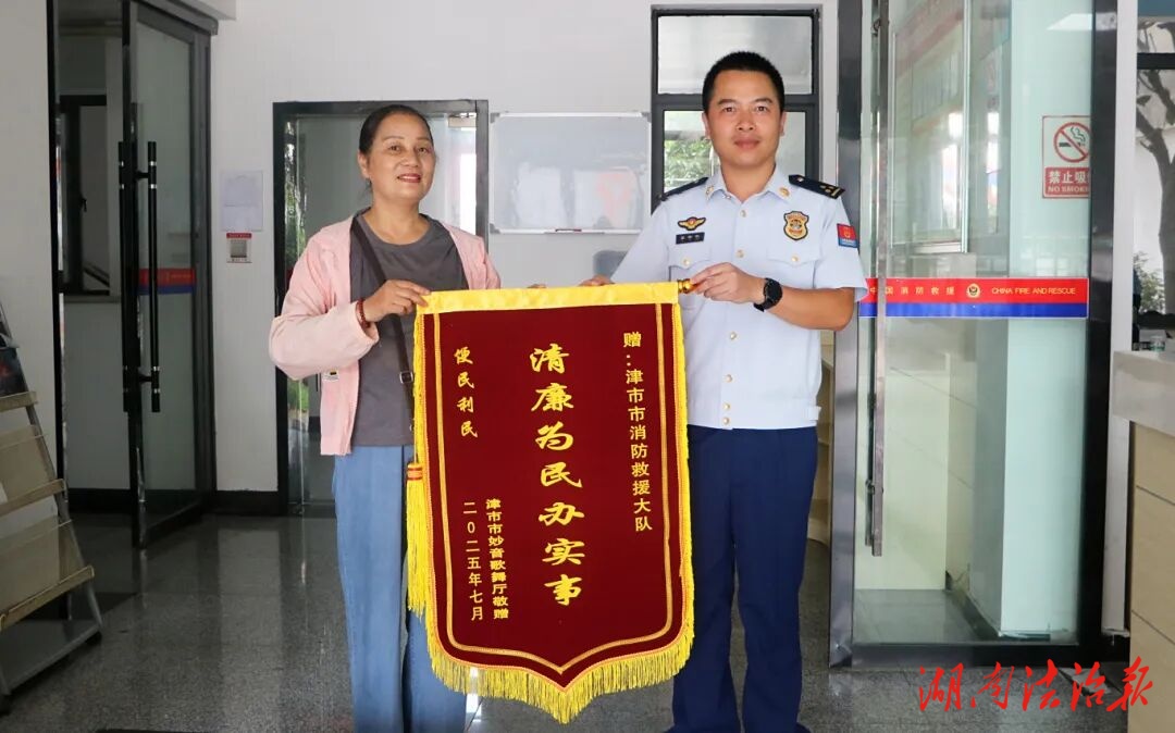 ?鐘女士將一面印著“廉潔為民辦實(shí)事”的錦旗送到津市消防救援大隊(duì)。