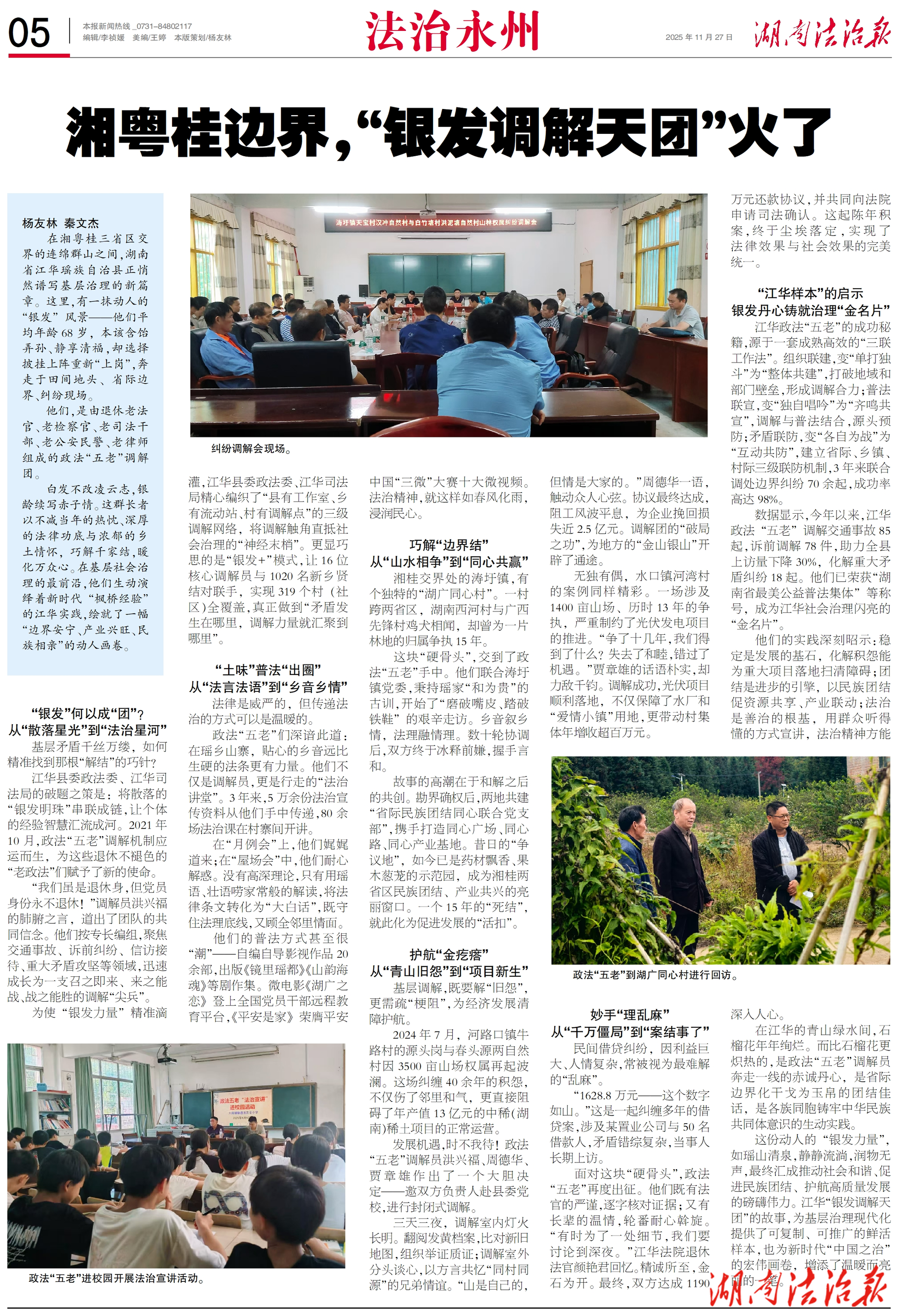 白發(fā)不改凌云志,銀齡續(xù)寫赤子情。這群長(zhǎng)者以不減當(dāng)年的熱忱、深厚的法律功底與濃郁的鄉(xiāng)土情懷,巧解千家結(jié),暖化萬眾心。在基層社會(huì)治理的最前沿,他們生動(dòng)演繹著新時(shí)代“楓橋經(jīng)驗(yàn)”的江華實(shí)踐,繪就了一幅“邊界安寧、產(chǎn)業(yè)興旺、民族相親”的動(dòng)人畫卷。