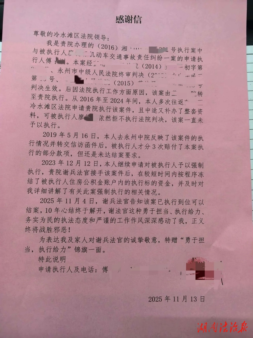 2025年7月,湖南法院全面并入全國“一張網(wǎng)”。面對該案執(zhí)行“僵局”,謝兵果斷轉(zhuǎn)變思路,依托“一張網(wǎng)”查控系統(tǒng)“線上全景掃描”被執(zhí)行人名下財產(chǎn),線下帶隊赴被執(zhí)行人工作地實地走訪調(diào)查,實現(xiàn)線上線下同步發(fā)力。經(jīng)查詢,之前一直處于停薪留職狀態(tài)的被執(zhí)行人廖某即將退休,且發(fā)現(xiàn)有可以提取的公積金予以執(zhí)行。冷水灘區(qū)法院立即依法凍結(jié)了被執(zhí)行人廖某的公積金,迫使被執(zhí)行人廖某主動履行責(zé)任。譚先生在收到最后一筆執(zhí)行案款后,第一時間給謝兵打來電話:“謝法官,錢都收到了,真是太感謝了。”幾天后,譚先生專程來到法院贈送錦旗,點贊法院“勇于擔(dān)當(dāng),執(zhí)行給力”。該案得以順利執(zhí)結(jié),正是充分應(yīng)用了“一張網(wǎng)”系統(tǒng)的強大功能,讓十年老案畫上圓滿句號。(供稿:冷水灘區(qū)人民法院)